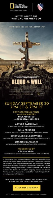On September 20, the author joined award-winning documentary producer-directors Sebastian Junger and Nick Quested, LULAC CEO Sindy Benavides, former Mexican Ambassador to the US Arturo Sarukhan, former New York Times reporter Julia Preston, and ABC News White House Correspondent Cecilia Vega for a panel discussion following the world premiere of the upcoming National Geographic documentary Blood on the Wall. The film traces the roots of two intertwined phenomena – Mexican drug trafficking cartels and instability in Central America – that underlie the crisis at the US southern border.